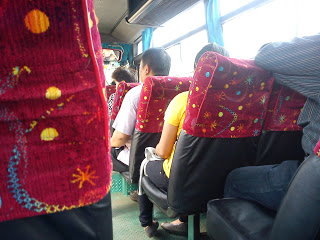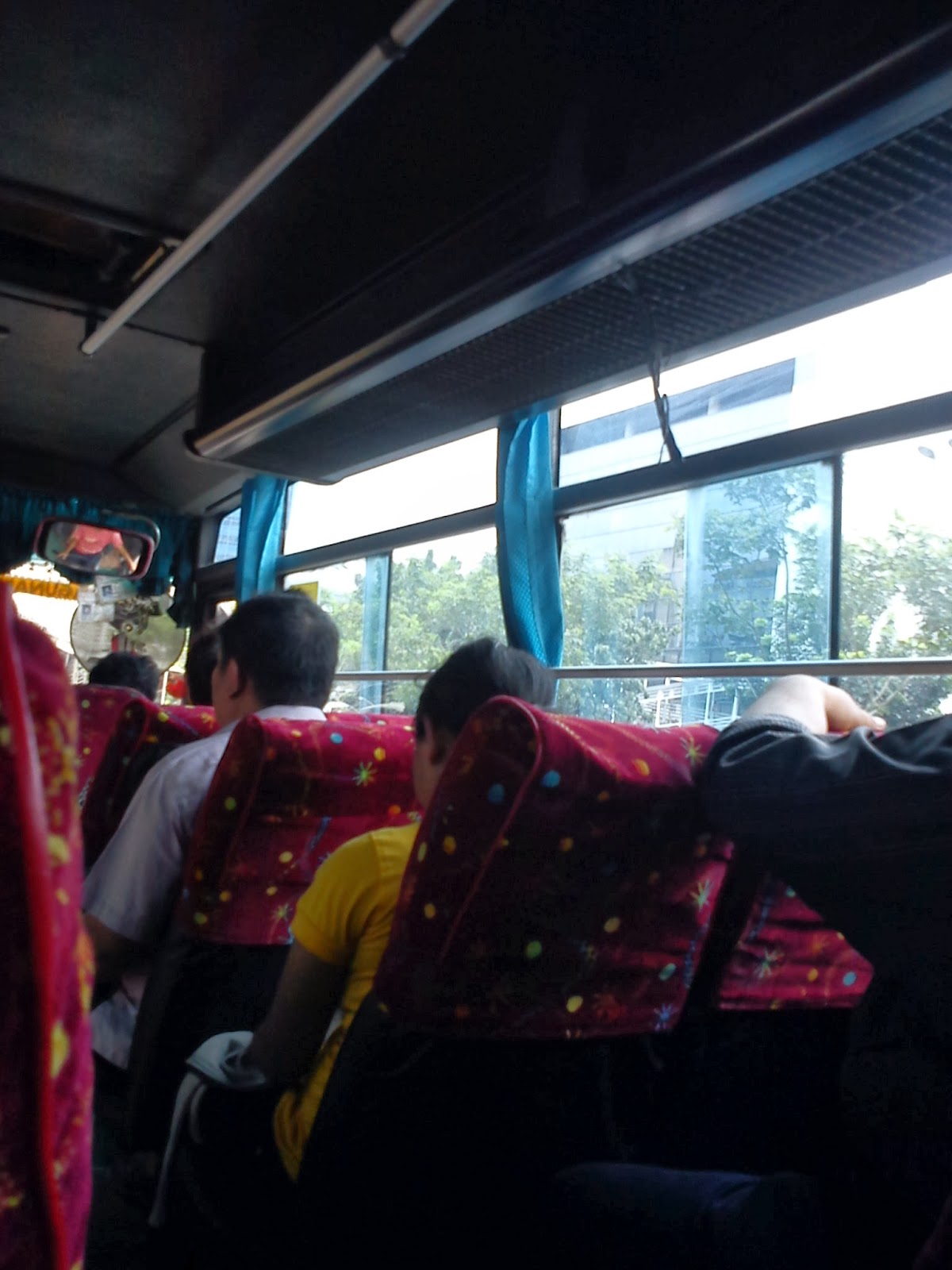 Beruntung, kopaja yang kami naiki masih menyisakan tempat duduk untuk kami bertiga. Nah yang lebih beruntung lagi, kopaja yang kami naiki perabotnya masih baru. Terdapat sarung berwarna merah di tempat duduknya. Bahkan ada tempat menaruh barang di atapnya. Yah, meskipun saya ragu ada penumpang yang menaruh barang disitu. Seperti ini penampakannya….