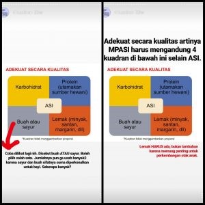 Kapasitas lambung bayi masih kecil sehingga saya sangat setuju teori dokter Meta soal pengosongan lambung itu. Setelah dua jam artinya bayi akan lapar kan? Karena perutnya sudah separuh kosong. Soal jadwal makan yang disiplin bikin lapar juga setuju. Sama seperti kita, kalau biasa pagi sarapan trus tiba tiba gak sarapan kan kerasa lapar ya? Nah semacam itulah teorinya. Selain itu, dokter Meta juga membahas porsi nutrisi yang harus dipenuhi sekali makan. Dokmet menyebut menu 4 bintang yang selama ini beredar di masyarakat, yang beliau gak tau itu darimana asal sebutannya. Dokmet memberikan sebutan yang lain yaitu menu 4 kuadran selain ASI yaitu Karbohidrat, Protein, Lemak dan Buah/Sayur. Gambar terlampir di bawah ya.